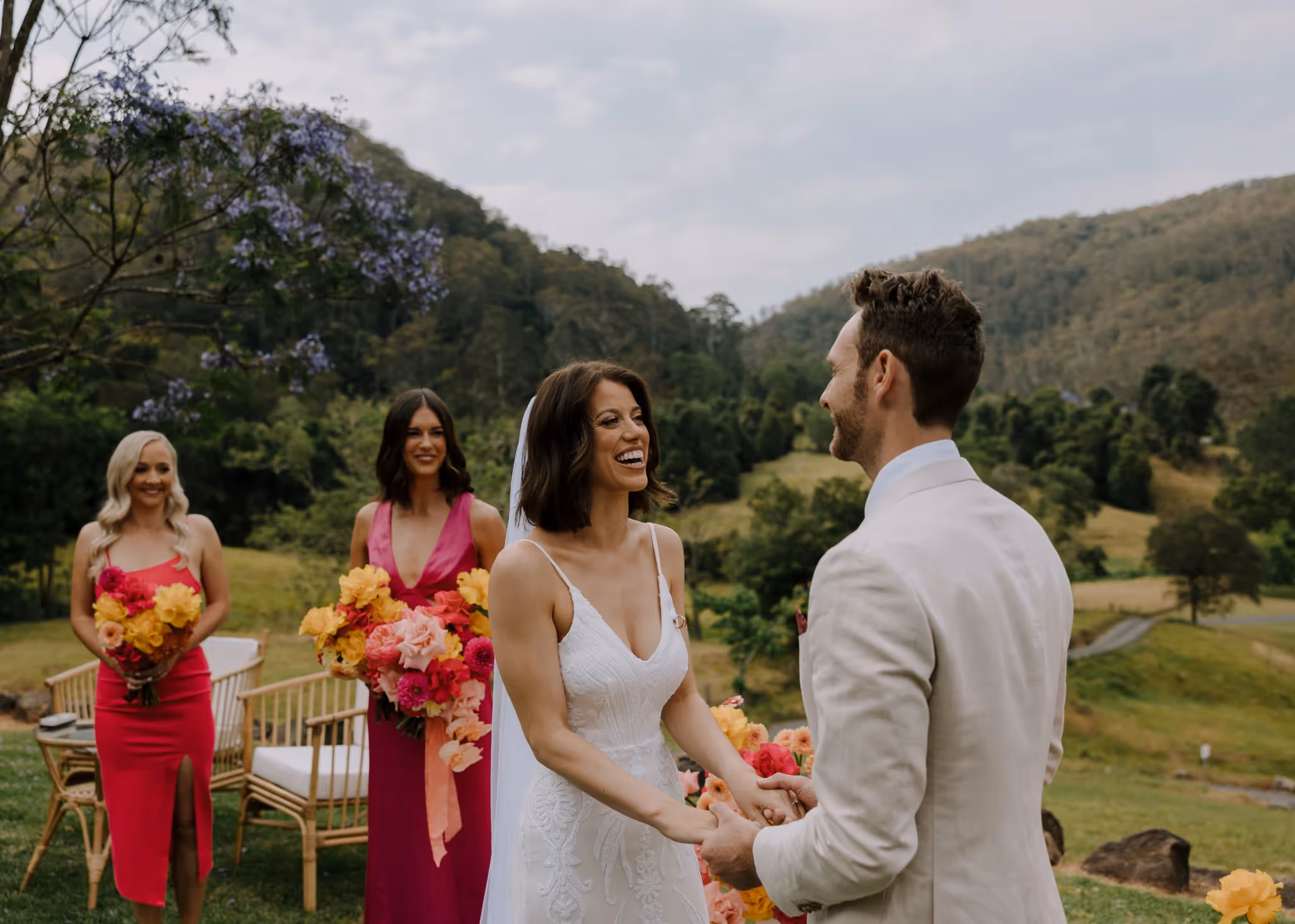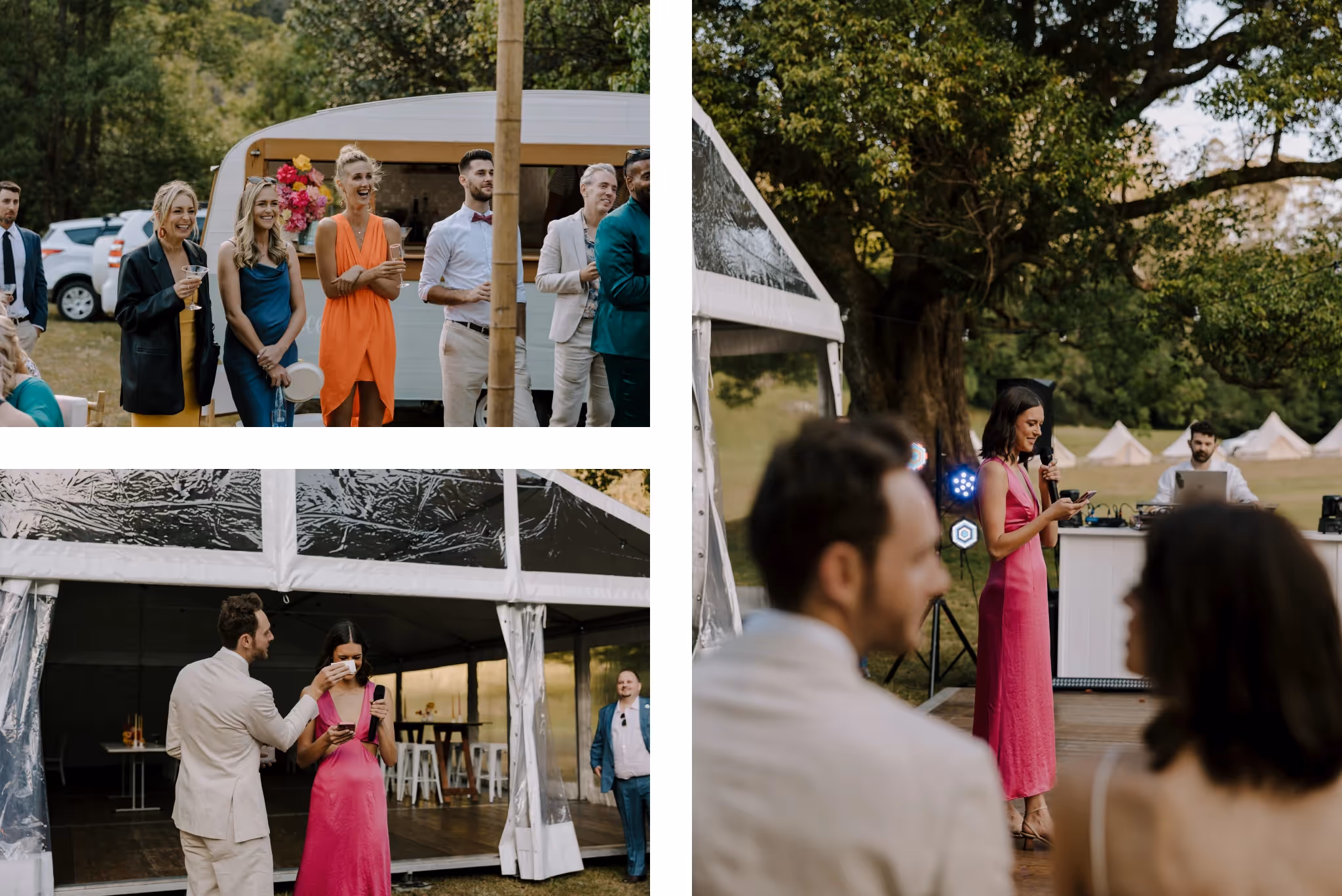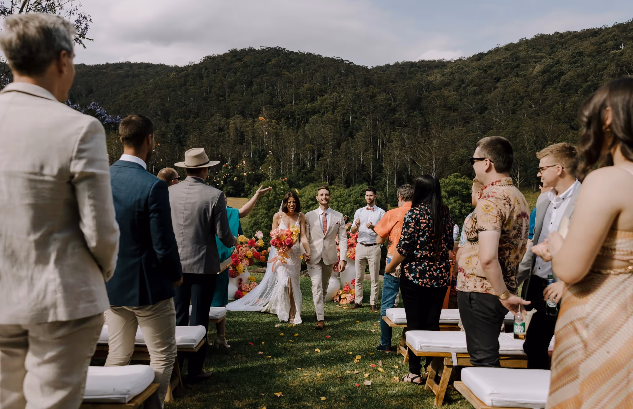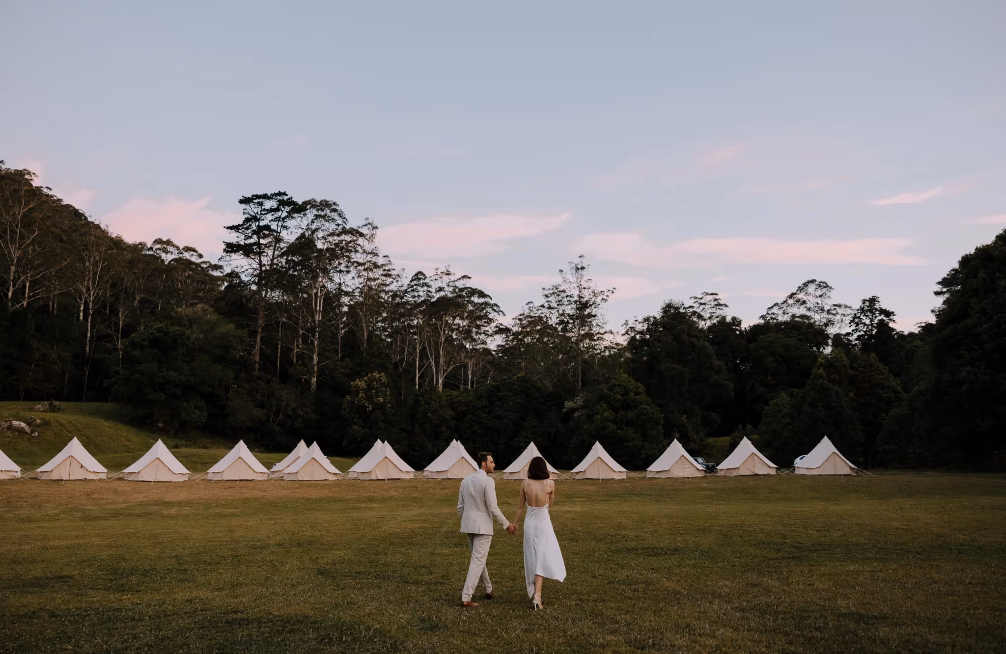 Ash & Jason met as professional dancers and I met them photographing their best friend's wedding. I'm always so grateful when family & friends I've met at weddings reach out and say 'we want you'. We jumped straight into what they were envisaging and my gosh.. it was all that and more. They invited 40 of their nearest and dearest to Bebeah Farm for a weekend festival with their glamping tents right next to the dance floor. Dance until you drop and roll into bed.Their festival was full of colourful styling, wood fired pizza, cocktails, laughing until you cry and CHECK OUT the first dance - I was cheering from behind the lens. Special mention to the team of incredible event planners & stylists at White Lane Events and Days Like These Events. Event planners are worth every single cent.Ash & Jason wanted their day to feel like uniquely 'them', Maximum time with their loved ones and full of that joy and cheekiness they enjoy together. Ash walked herself down the aisle and Jason's face says it all. The couple photos were just us walking with some cocktails and those two being silly and cute together in some pretty nice light. They even fed me gluten and diary free pizza and that kind of effort deserves a mention.