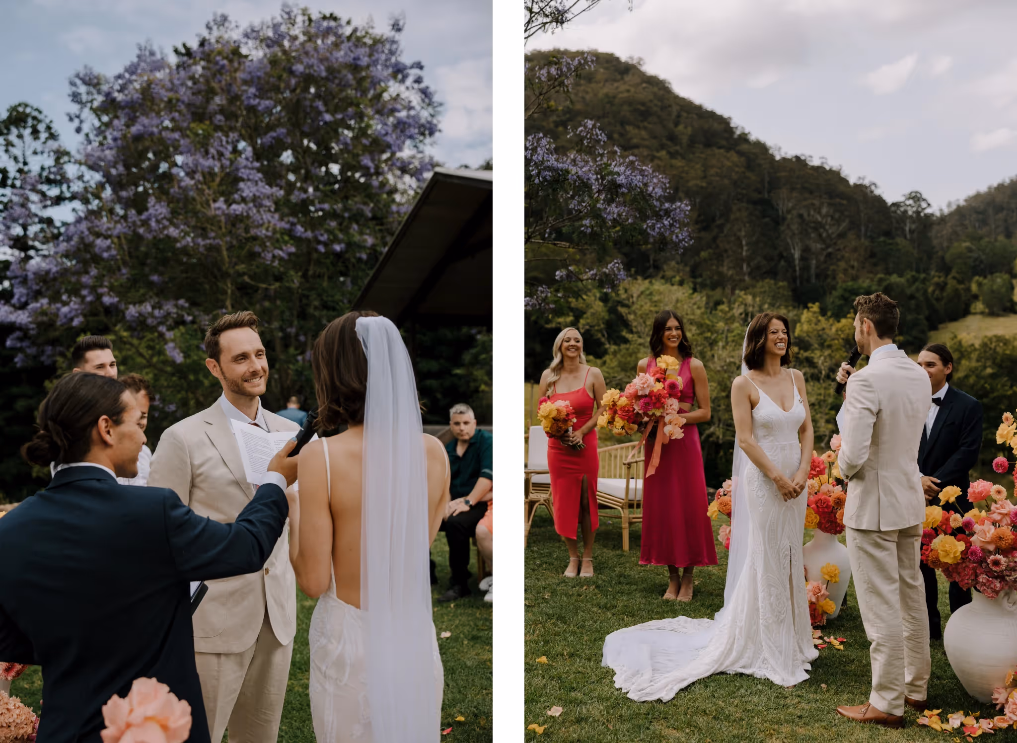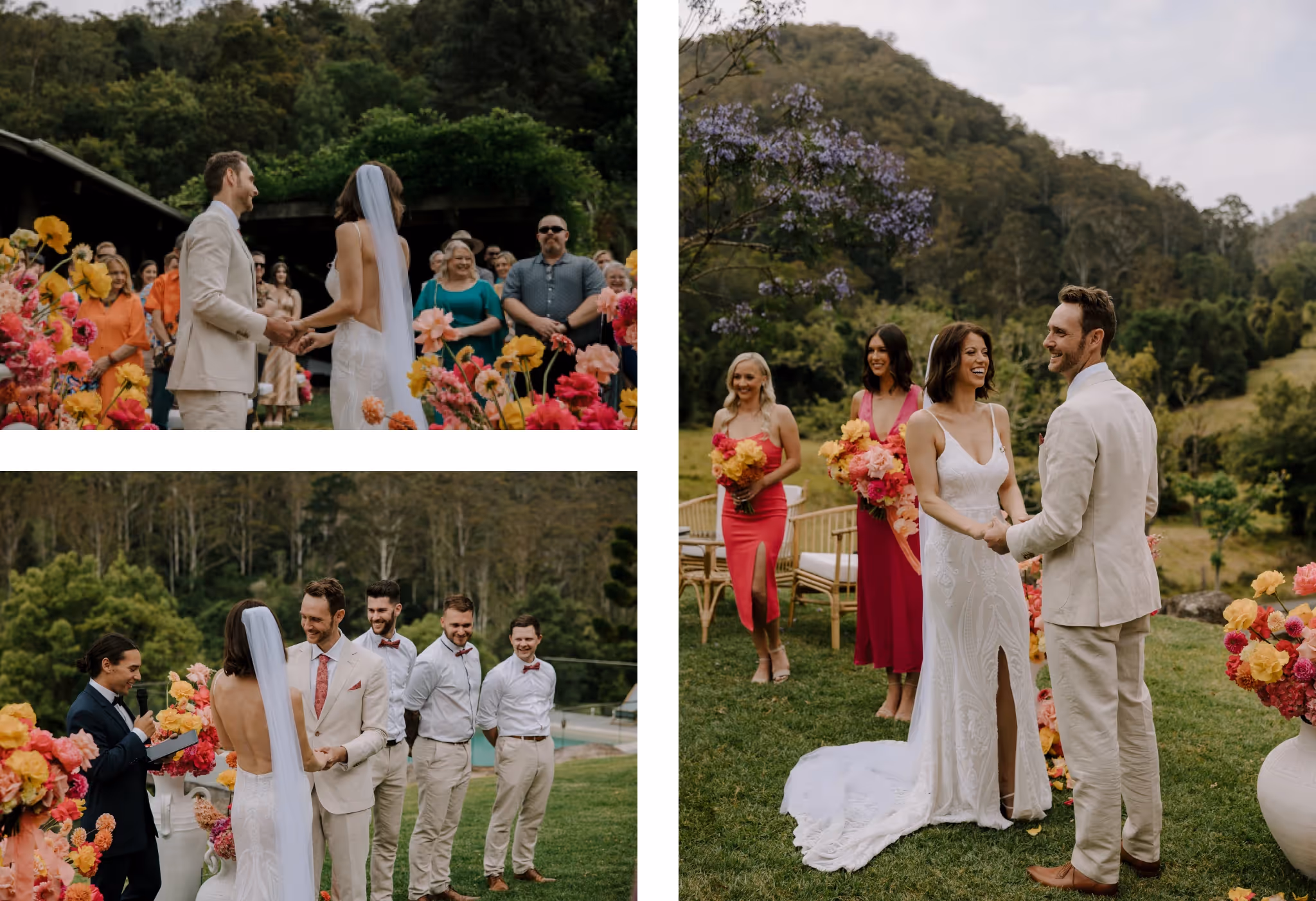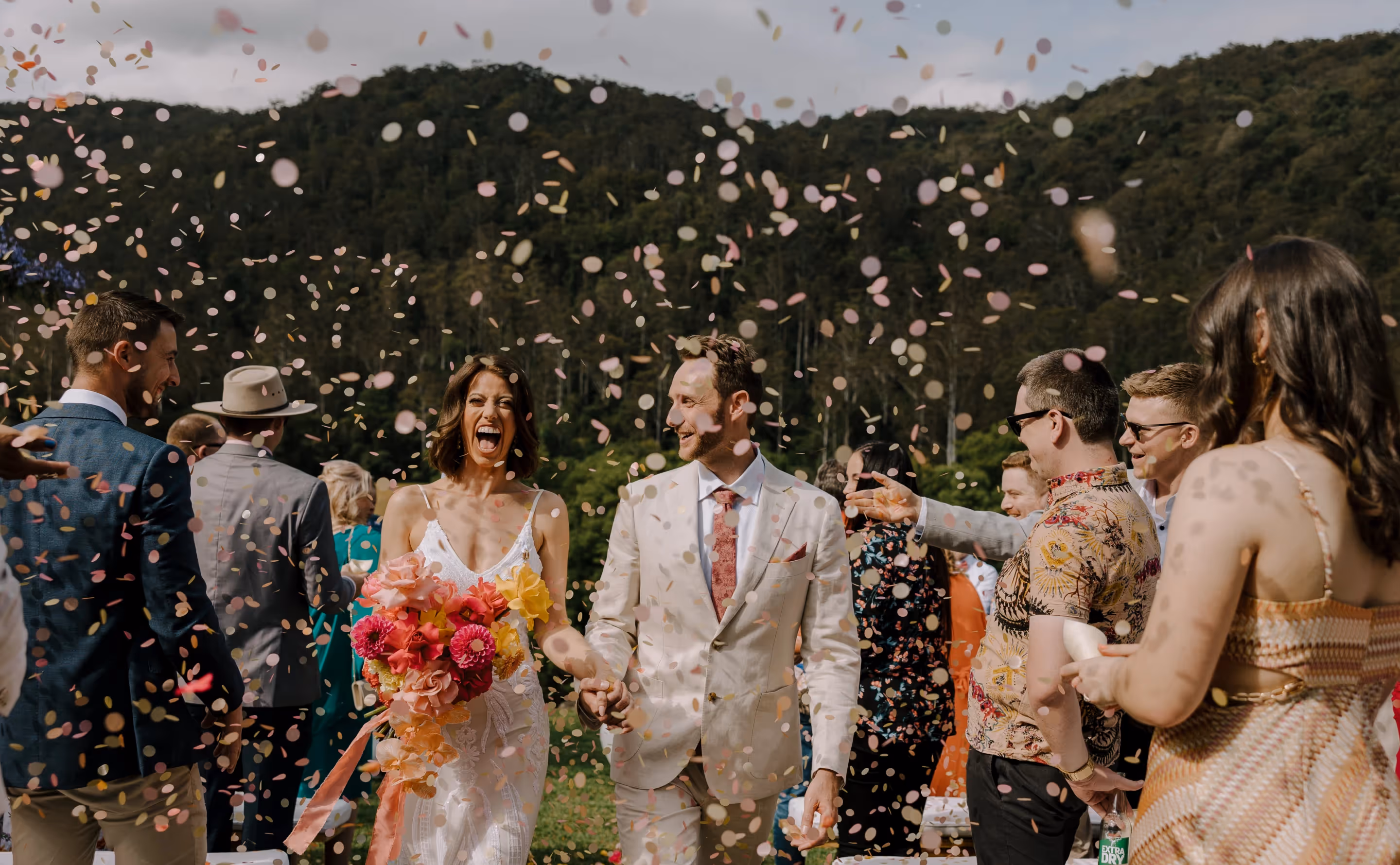 Ash & Jason met as professional dancers and I met them photographing their best friend's wedding. I'm always so grateful when family & friends I've met at weddings reach out and say 'we want you'. We jumped straight into what they were envisaging and my gosh.. it was all that and more. They invited 40 of their nearest and dearest to Bebeah Farm for a weekend festival with their glamping tents right next to the dance floor. Dance until you drop and roll into bed.Their festival was full of colourful styling, wood fired pizza, cocktails, laughing until you cry and CHECK OUT the first dance - I was cheering from behind the lens. Special mention to the team of incredible event planners & stylists at White Lane Events and Days Like These Events. Event planners are worth every single cent.Ash & Jason wanted their day to feel like uniquely 'them', Maximum time with their loved ones and full of that joy and cheekiness they enjoy together. Ash walked herself down the aisle and Jason's face says it all. The couple photos were just us walking with some cocktails and those two being silly and cute together in some pretty nice light. They even fed me gluten and diary free pizza and that kind of effort deserves a mention.